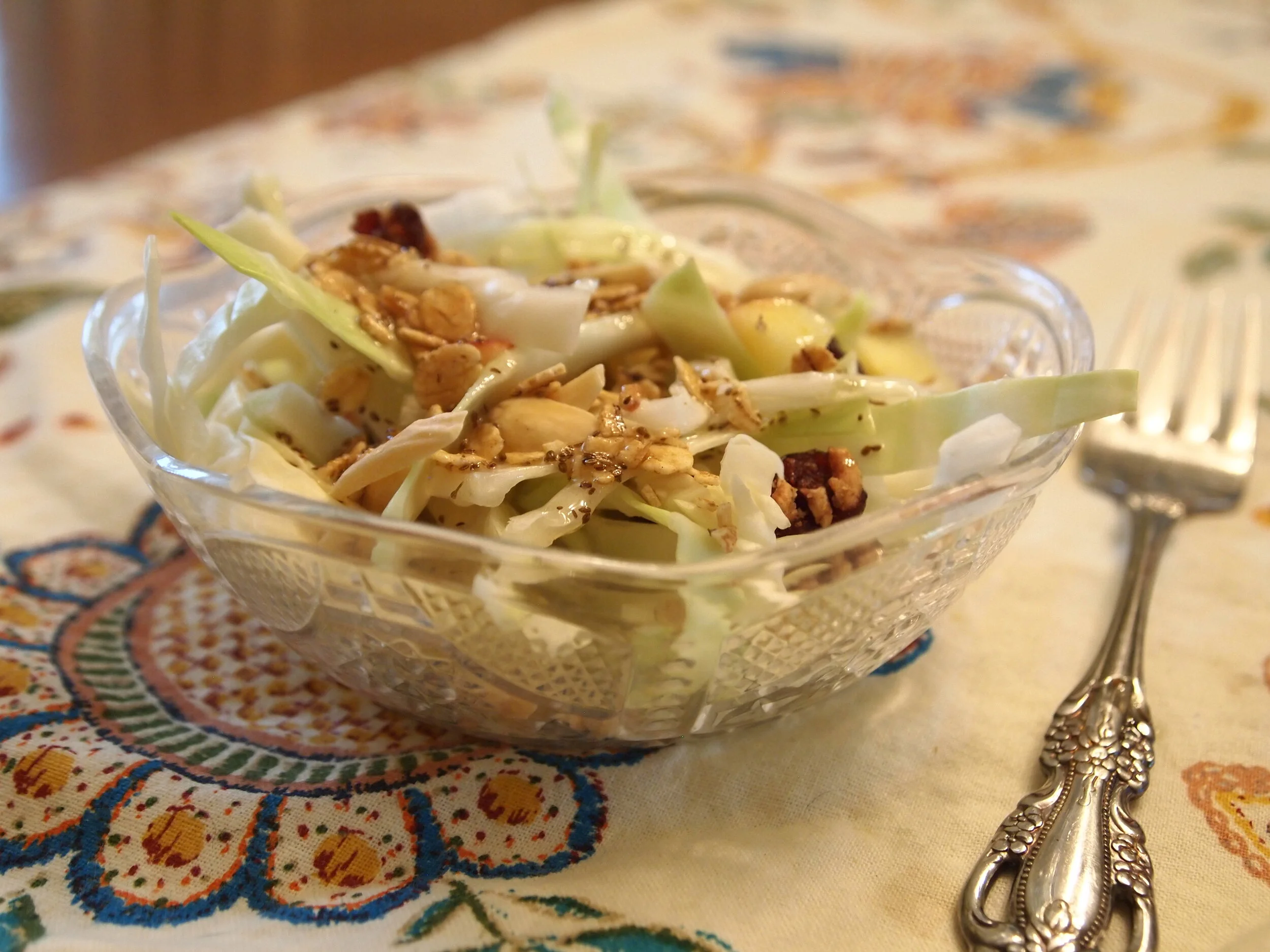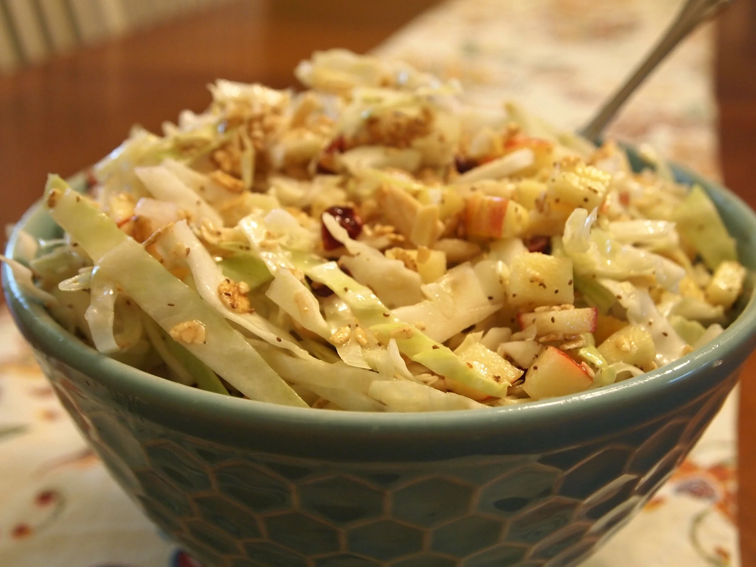 Preheat oven to 350°. Spread Burl out on a cookie sheet and toast for about 5 minutes. Let cool while you prepare the rest. Shred the cabbage into bite-size pieces into a medium-sized bowl. Finely chop the apples and onion and add to the bowl. Add cranberries and almonds and toss well to ensure it’s evenly mixed.